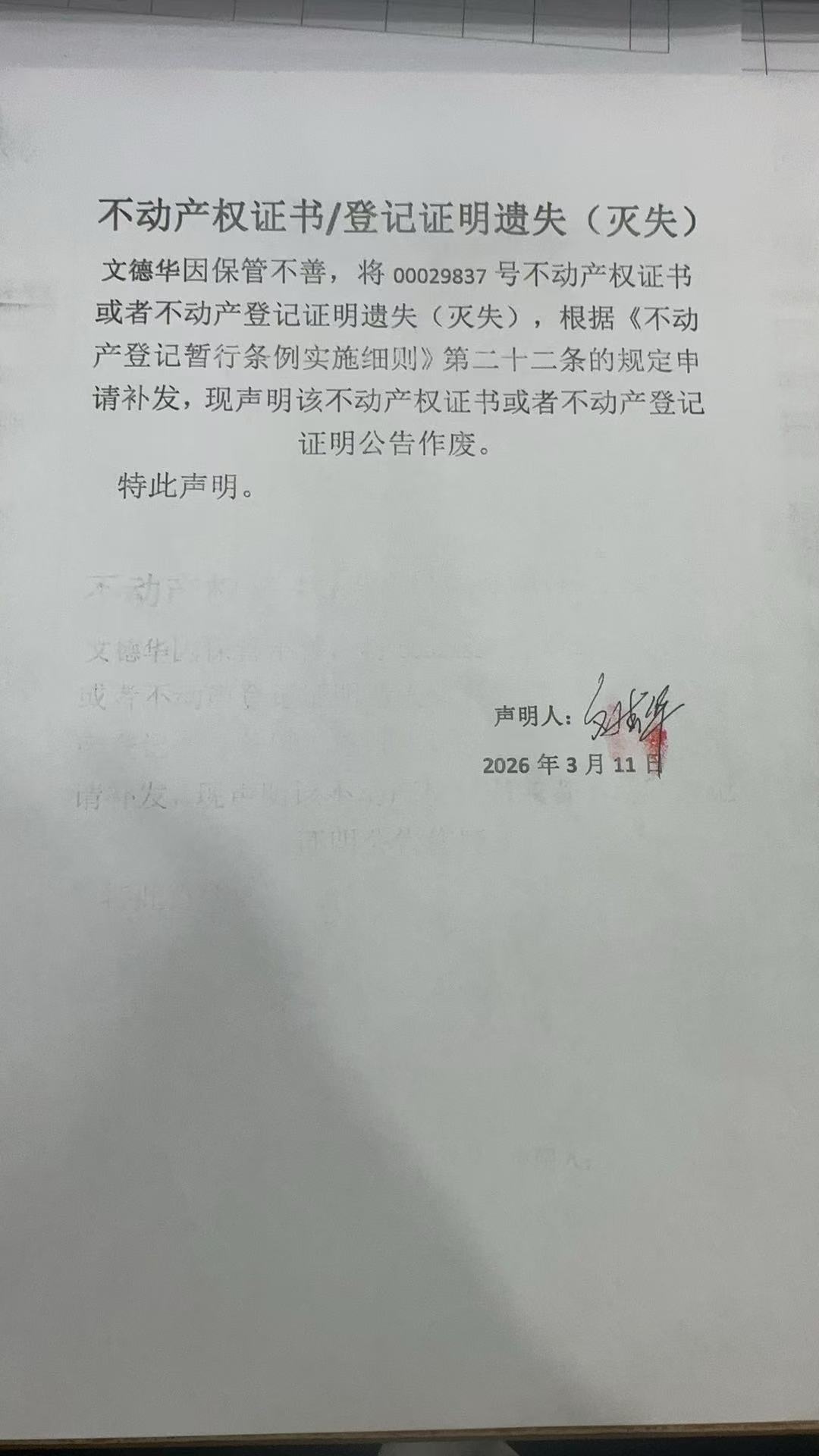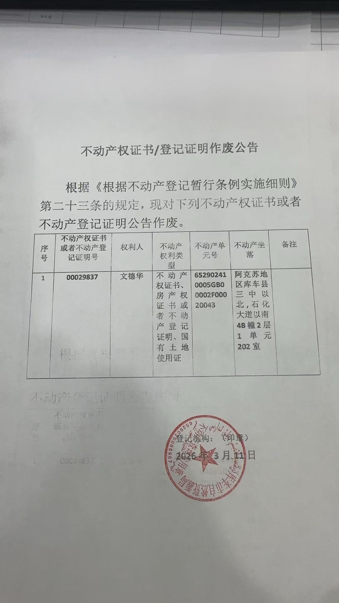 关于文德华库车县三中以北,石化大道以南4B幢2层 元1单202室不动产权证书遗失公告