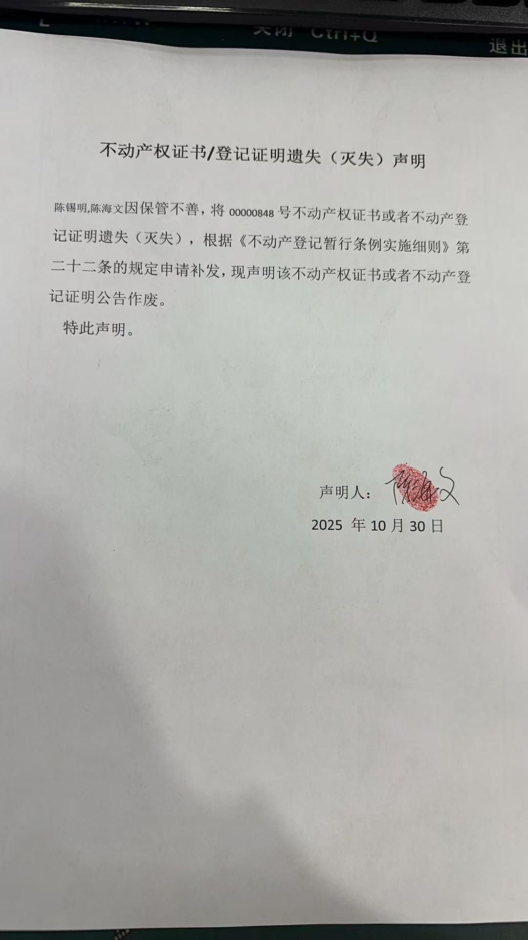 关于陈锡明,陈海文步行街一期 L1 幢1层商铺105,106 室不动产权证明遗失公告