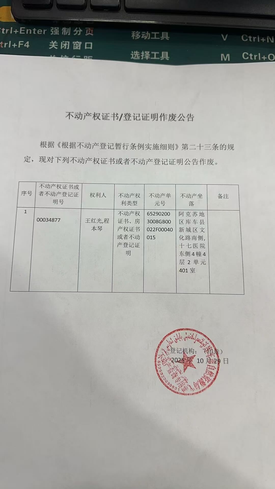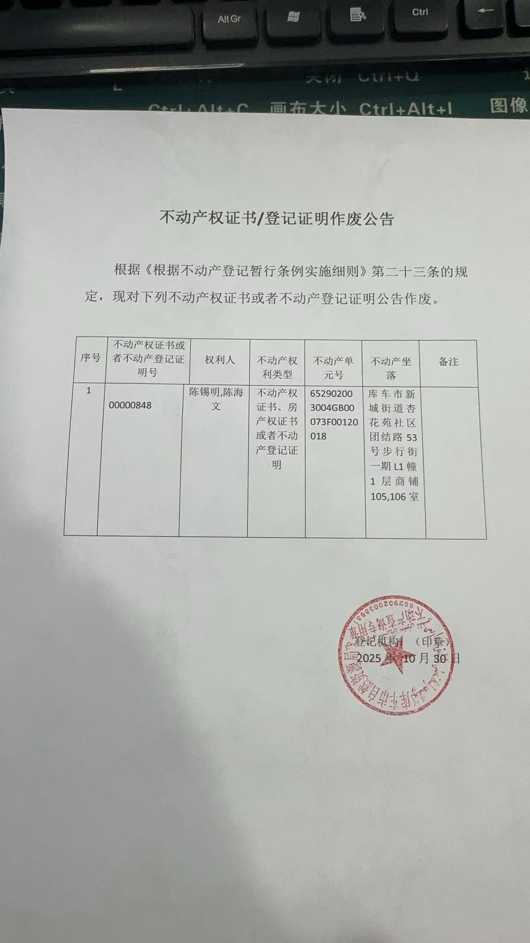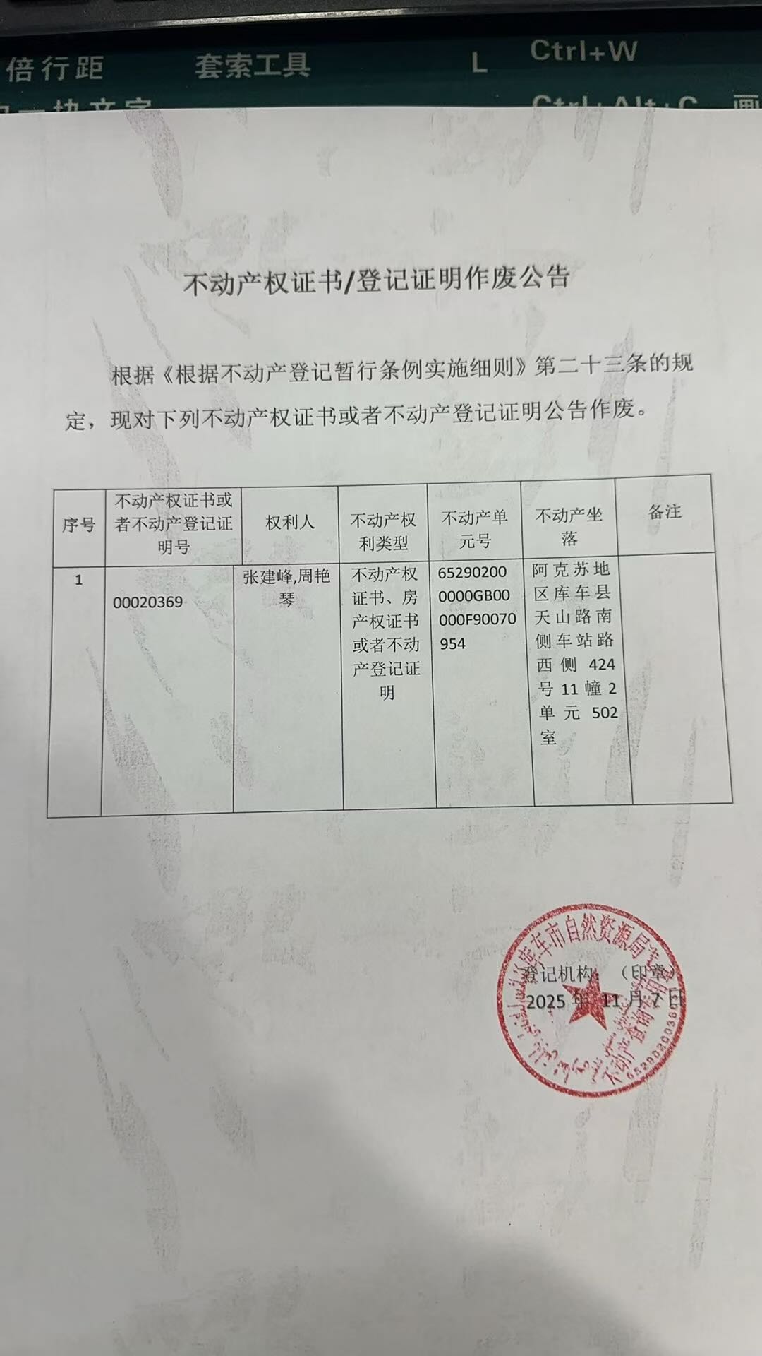库车市不动产登记中心 2025年11月7日 2025-181号公告