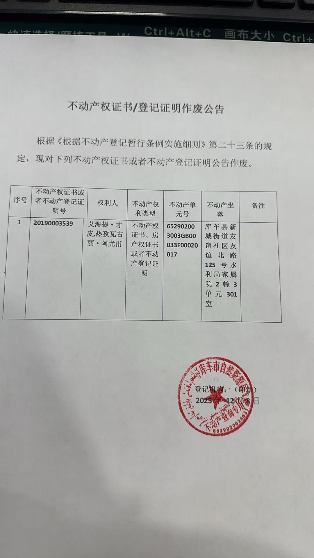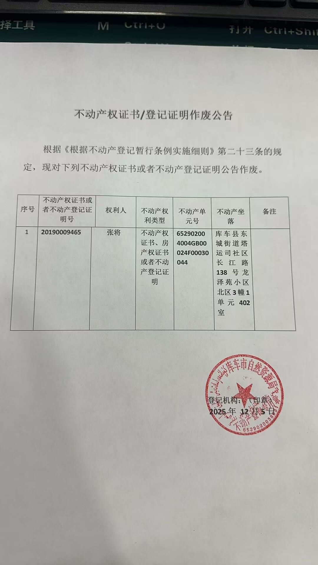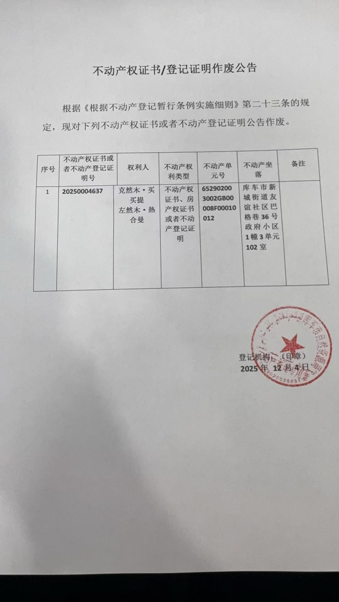 登记机构:库车市不动产登记中心 2025年12月8日 2025-199号公告