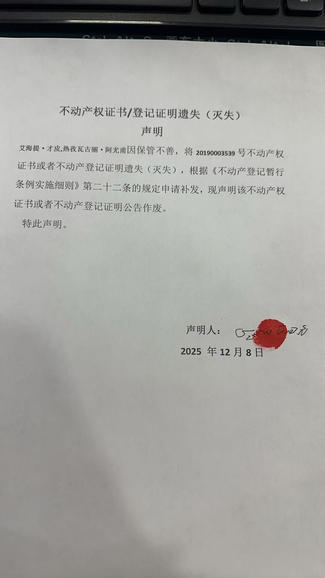 关于艾海提·才皮,热孜瓦古丽·阿尤甫水利局家属院2幢3单元301室不动产权证书遗失公告