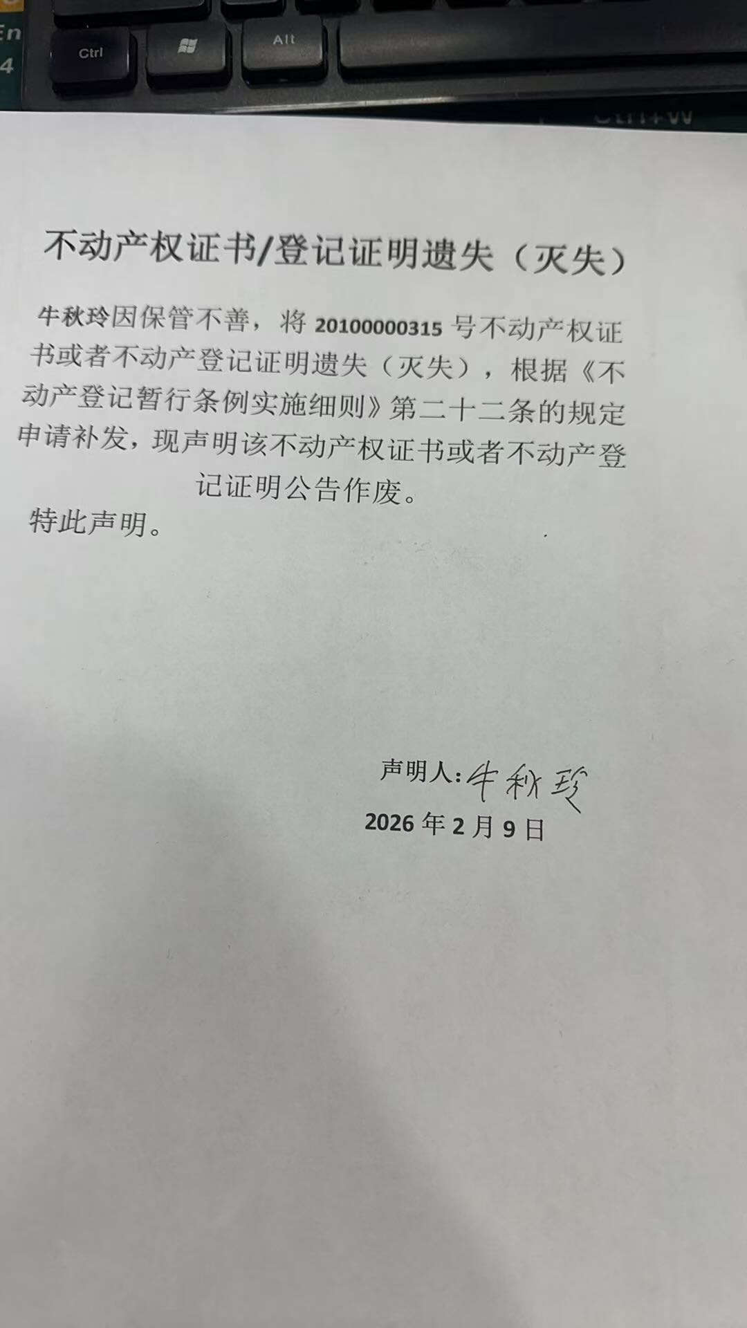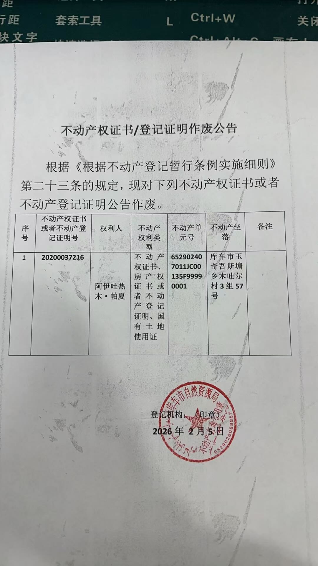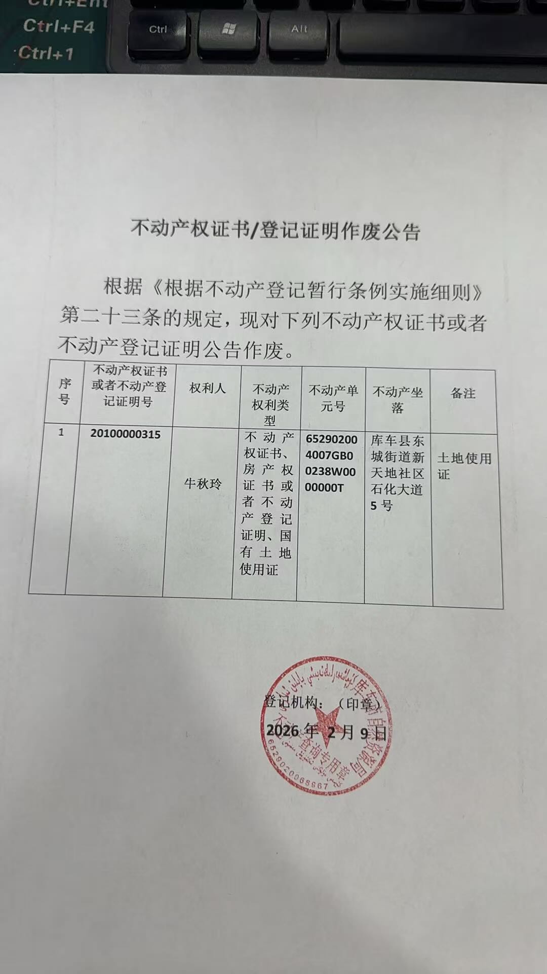 登记机构:库车市不动产登记中心 2026年2月4日 2026-023号公告