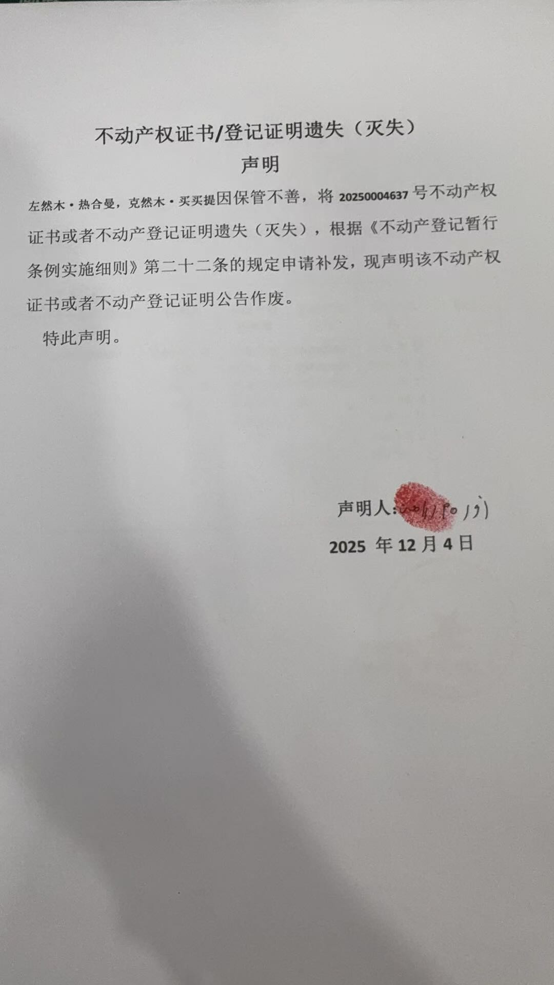 关于克然木·买买提 左然木·热合曼政府小区1幢3单元102室不动产权证书遗失公告