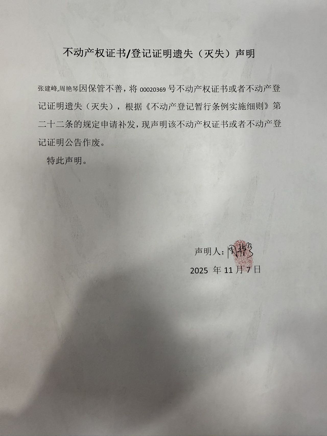 关于张建峰,周艳琴库车县天山路南侧车站路西侧424号11幢2单元502 室不动产权证书遗失公告