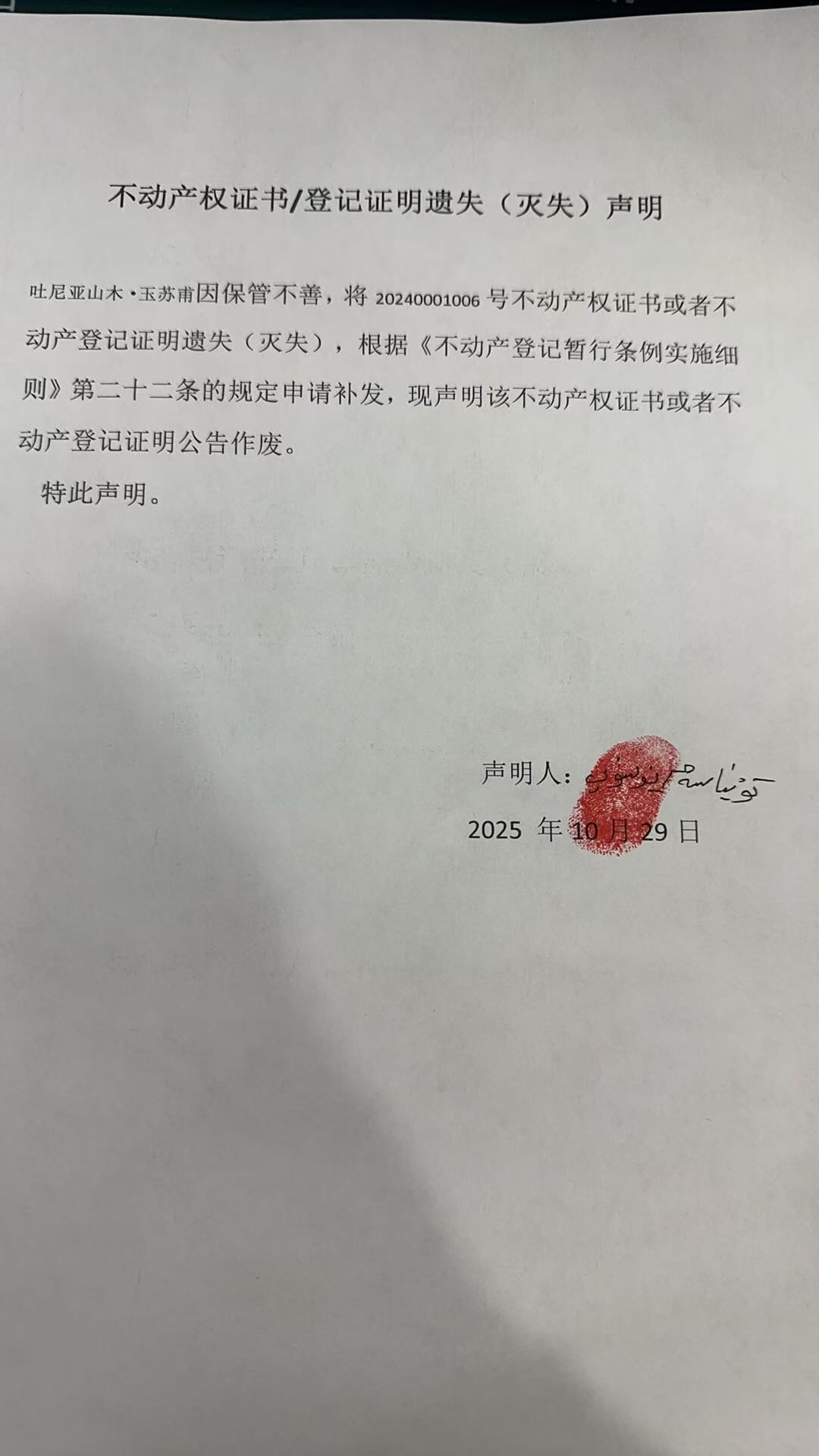 关于吐尼亚山木·玉苏甫天河小区1幢3单元 201室不动产权证书遗失公告
