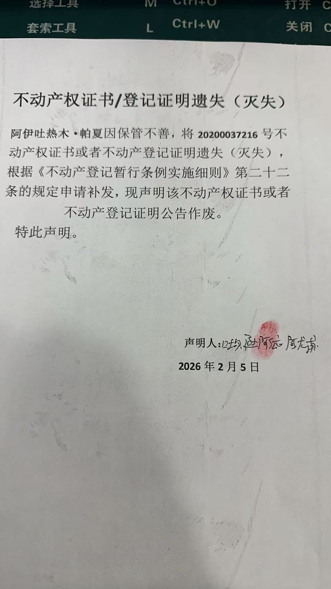关于阿伊吐热木·帕夏库车市玉奇吾斯塘乡木吐尔村3组57号不动产权证书遗失公告