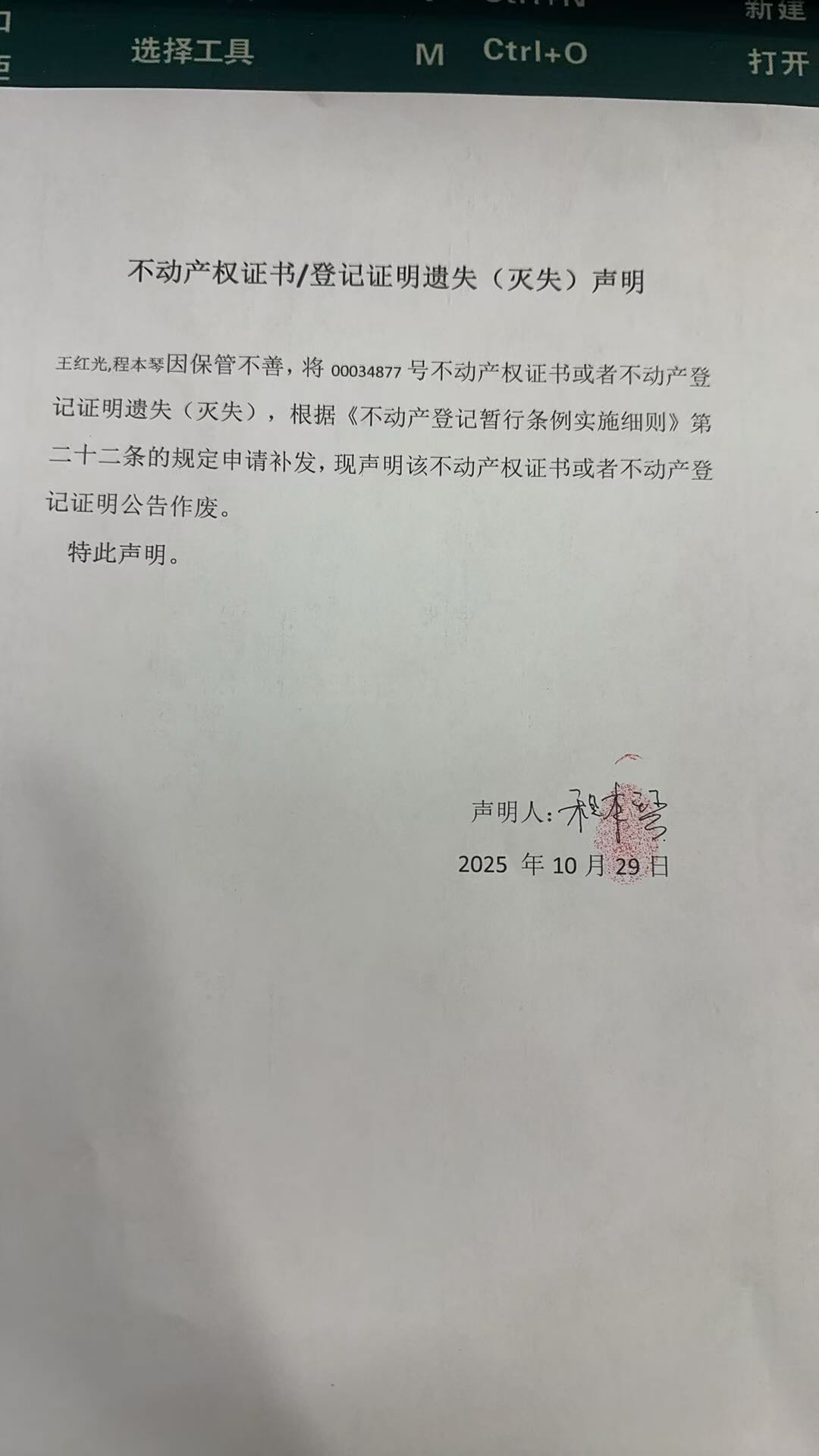 关于王红光,程本琴新城区文化路南侧,十七医院多东侧4幢4层2单元401室不动产权证书遗失公告