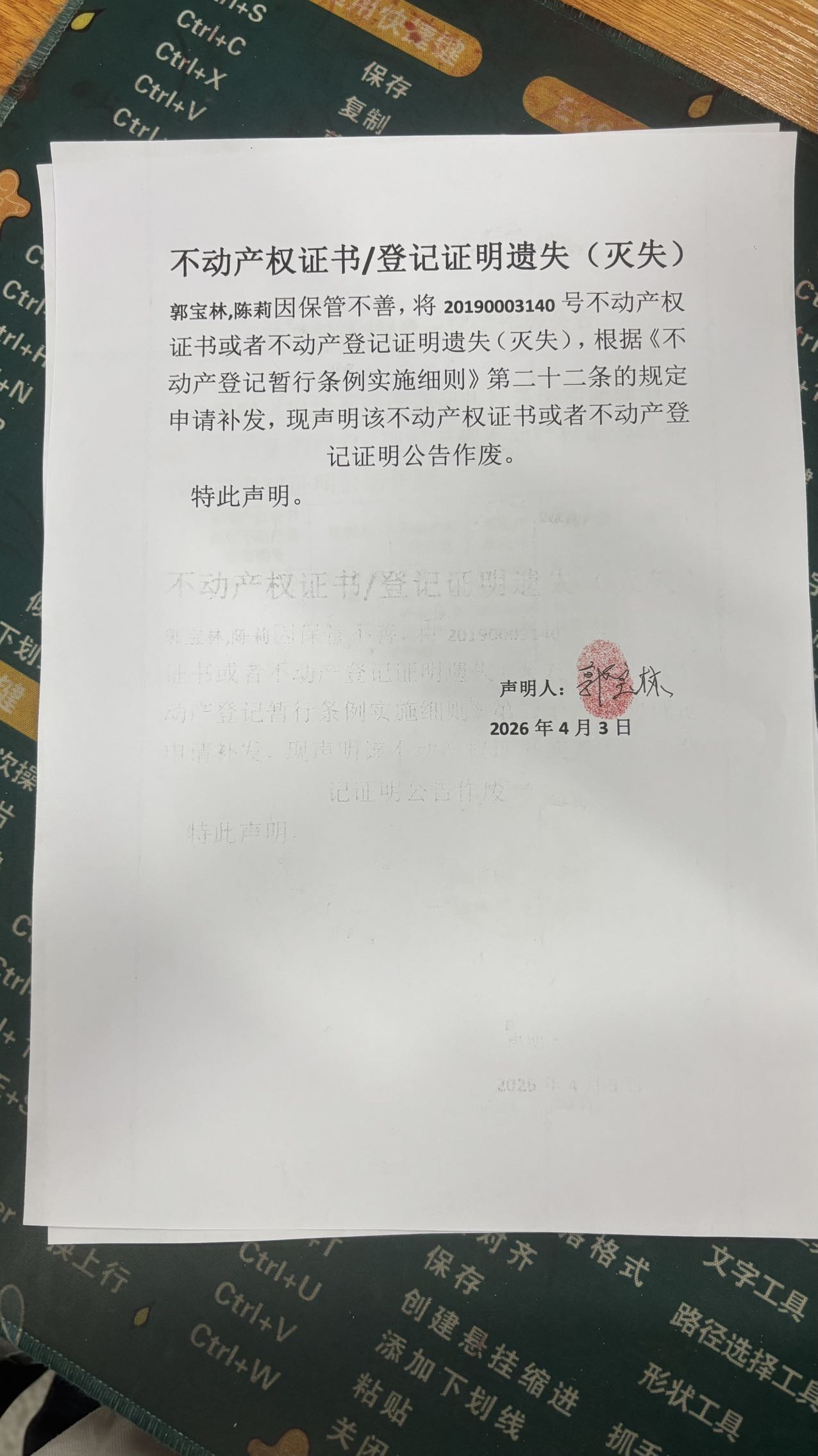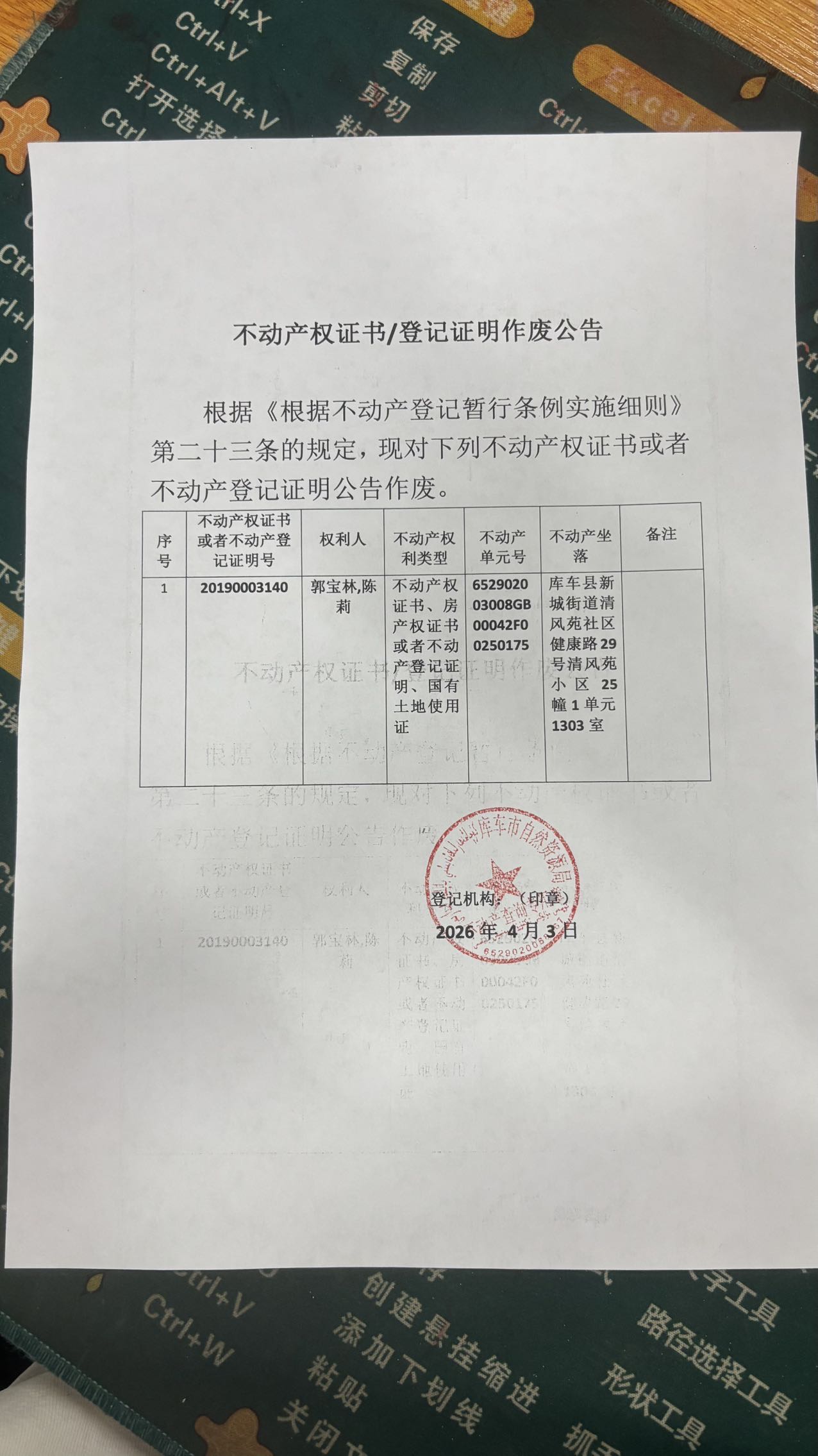 关于郭宝林,陈莉清风苑小区25幢1单元1303室不动产权证书遗失公告