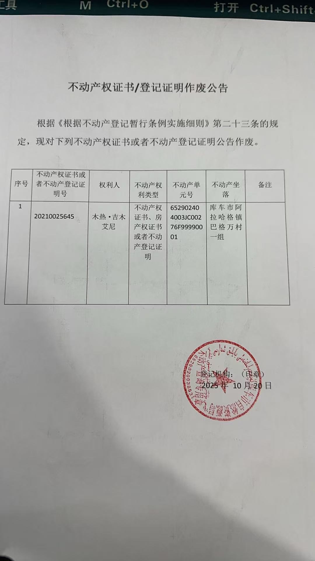 关于木热·吉木 艾尼库车市阿拉哈格 镇巴格万村一组不动产权证书遗失公告