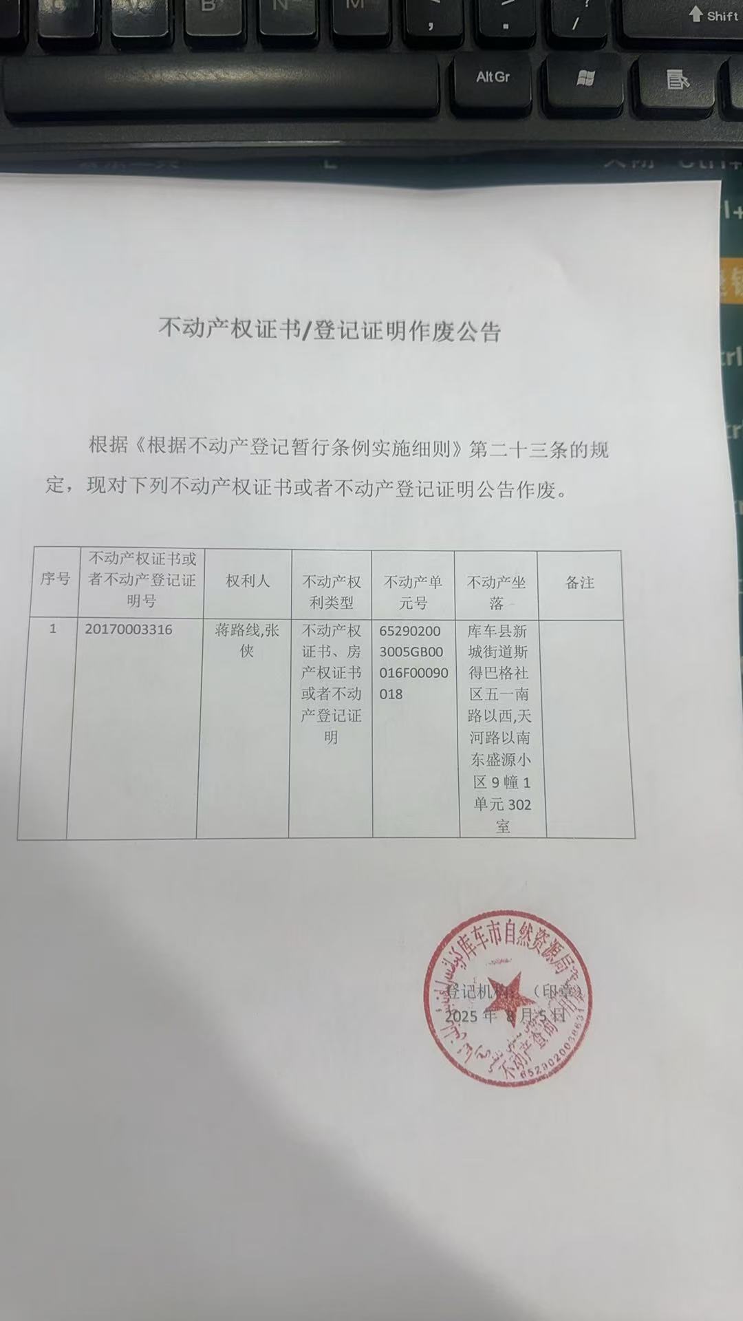 关于蒋路线库车县新城街道斯得巴格社区五一南路以西,天河路以南东盛源小区9幢一单元302室不动产权证书遗失公告