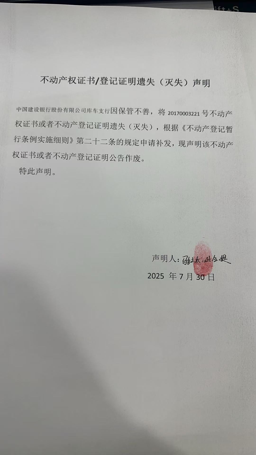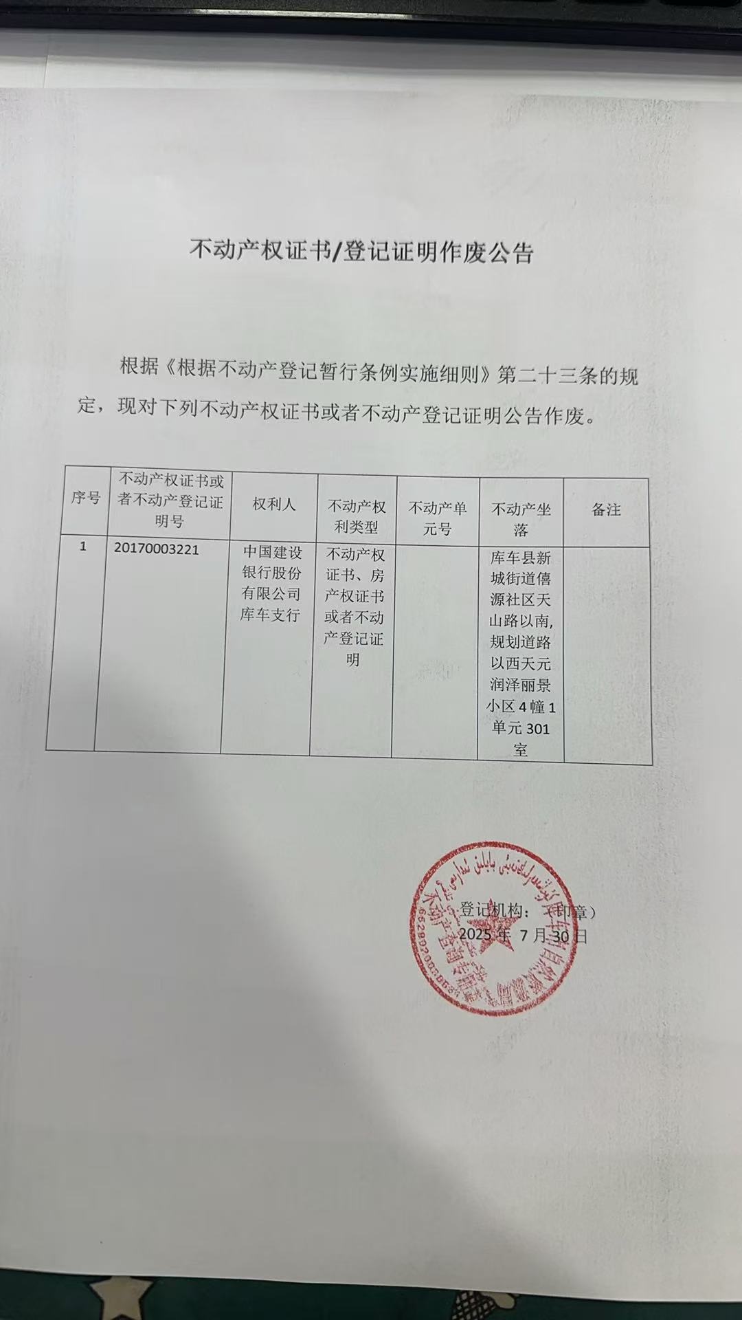 关于中国建设银行股份有限公司库车支行天元润泽丽景小区4幢1单元301室预告登记证明遗失公告