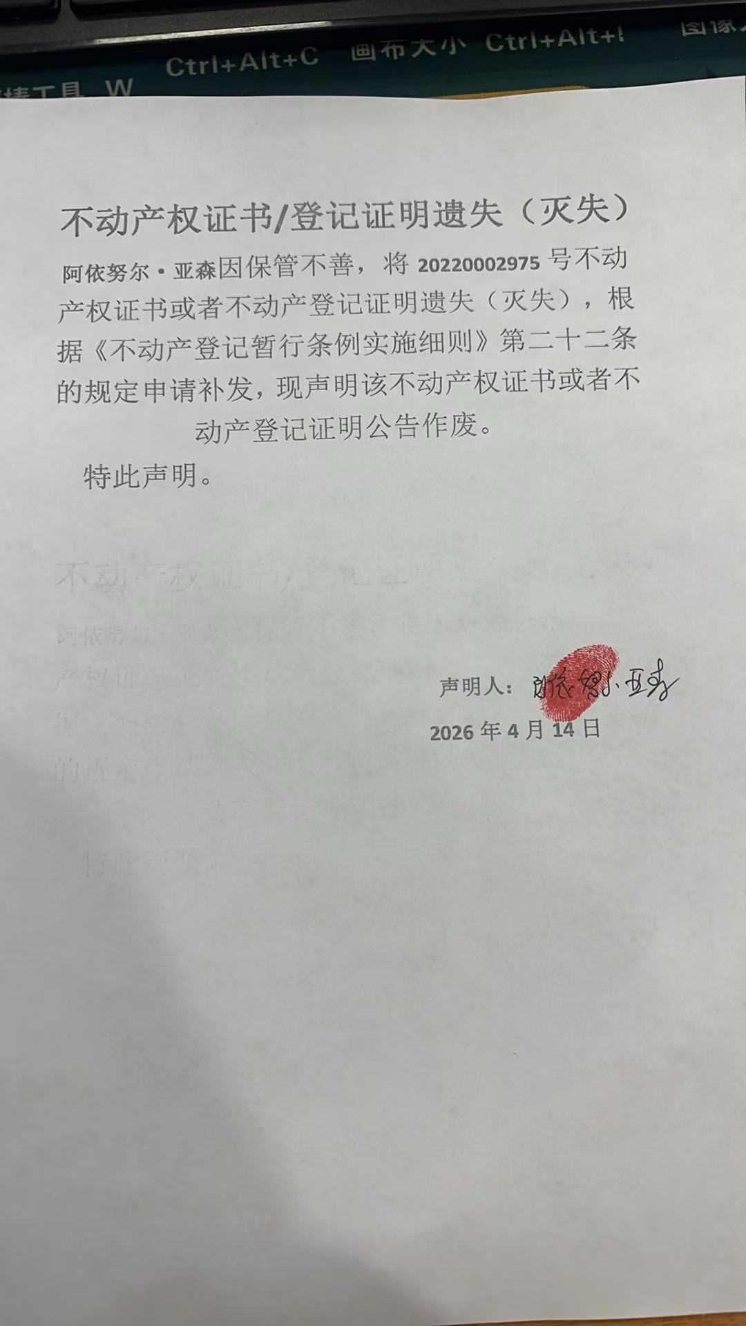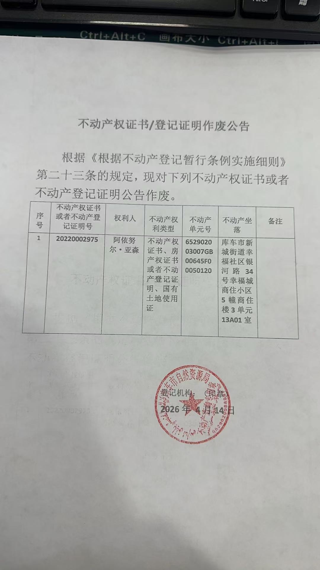 关于阿依努 尔·亚森幸福城商住小区5幢商住楼3单元13A01室不动产权证书遗失公告